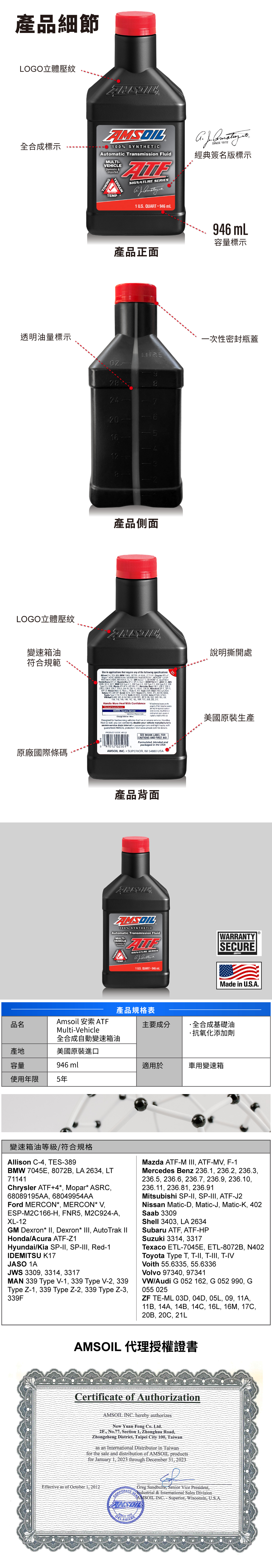 品名AMSOIL 安索  ATF Multi-Vehicle 全合成自動變速箱油