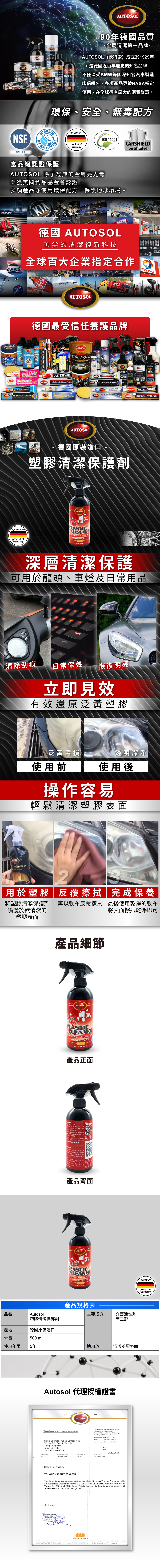 讓表面散發嶄新的光澤並防止塑膠老化、泛黃、變質或退色。使用範圍廣泛,為NASA指定的塑膠清潔保護膏同系列產品。