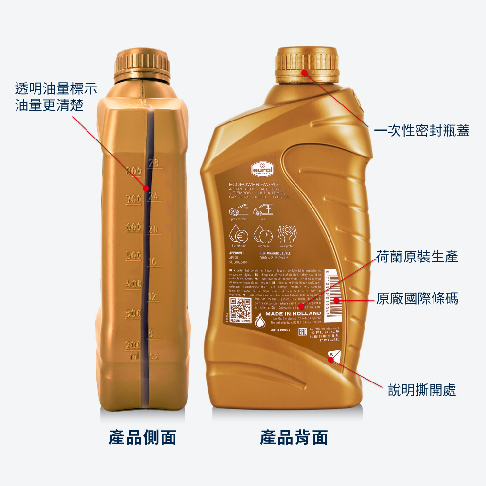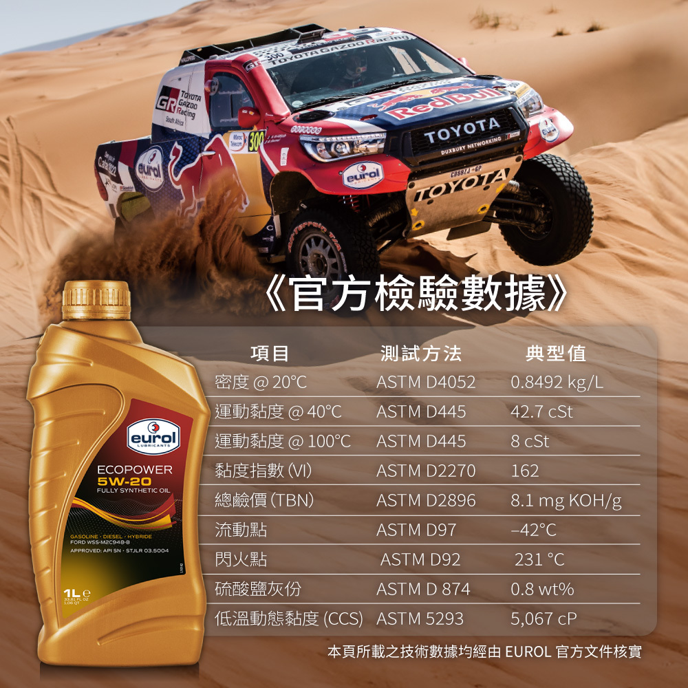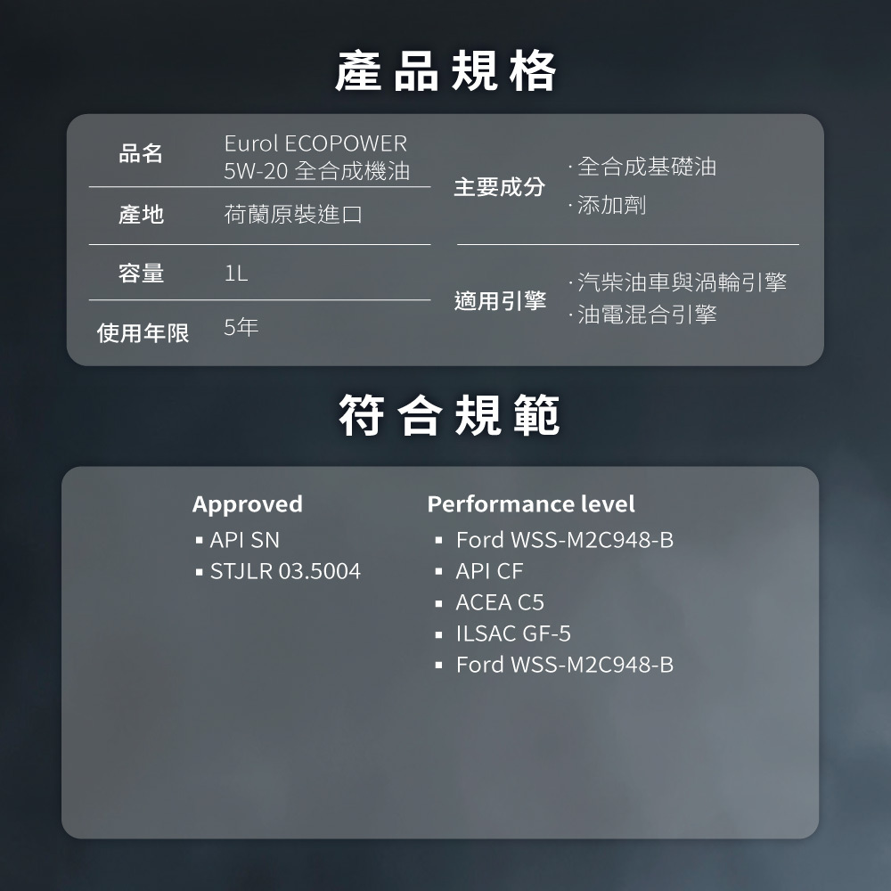 在需要以下任何機油規範的引擎中使用 Eurol Ecopower 5W20 全合成機油