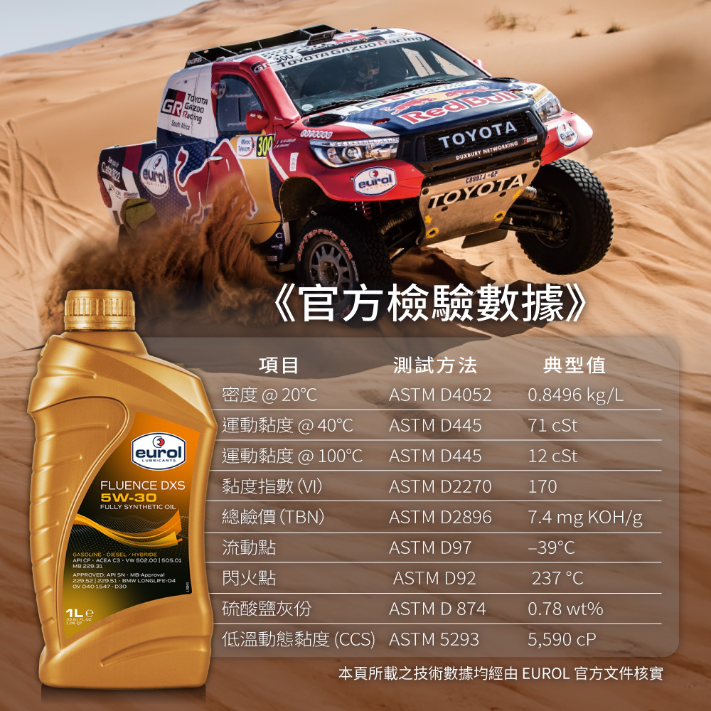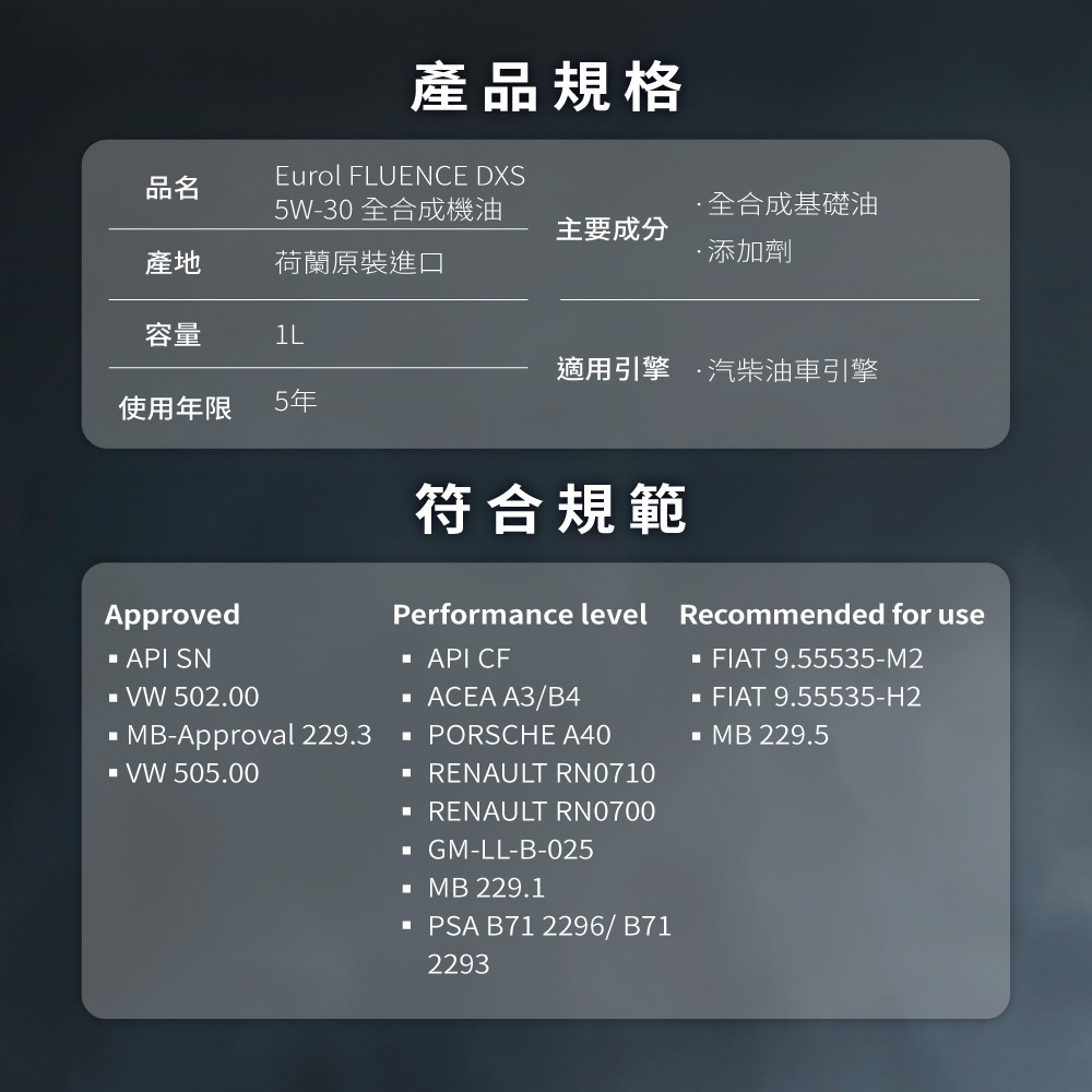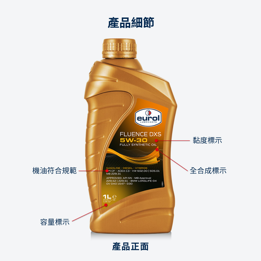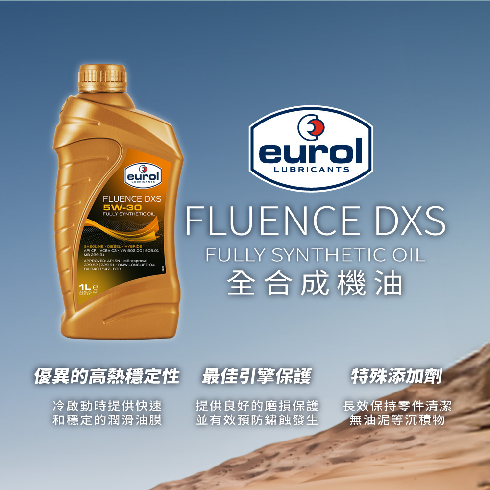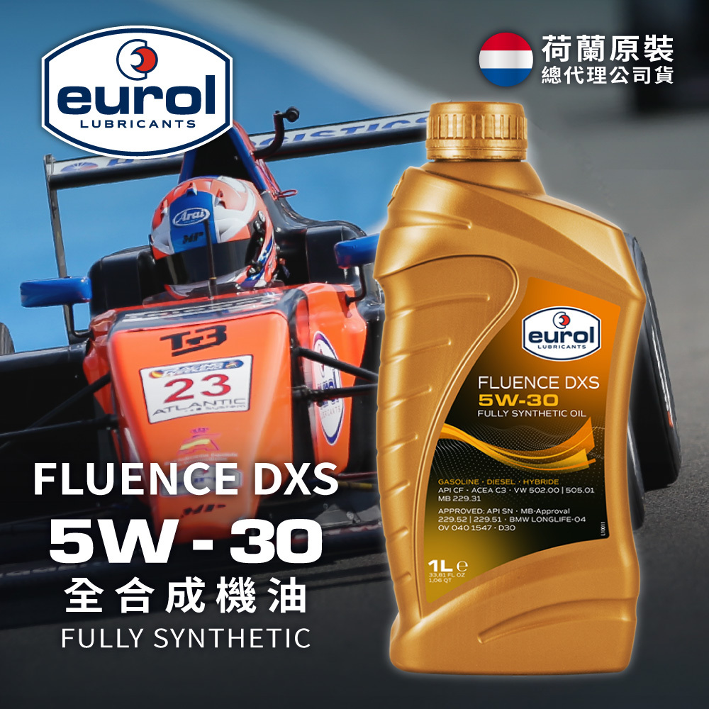 Eurol Fluence DXS 5W30 是一款用於汽柴油引擎的全合成高性能潤滑油,適用於一般轎車與輕型商用車的汽柴油引擎。這款油可用於配備觸媒轉化器、渦輪增壓引擎、柴油微粒過濾器(DPF)和直噴系統的汽車。