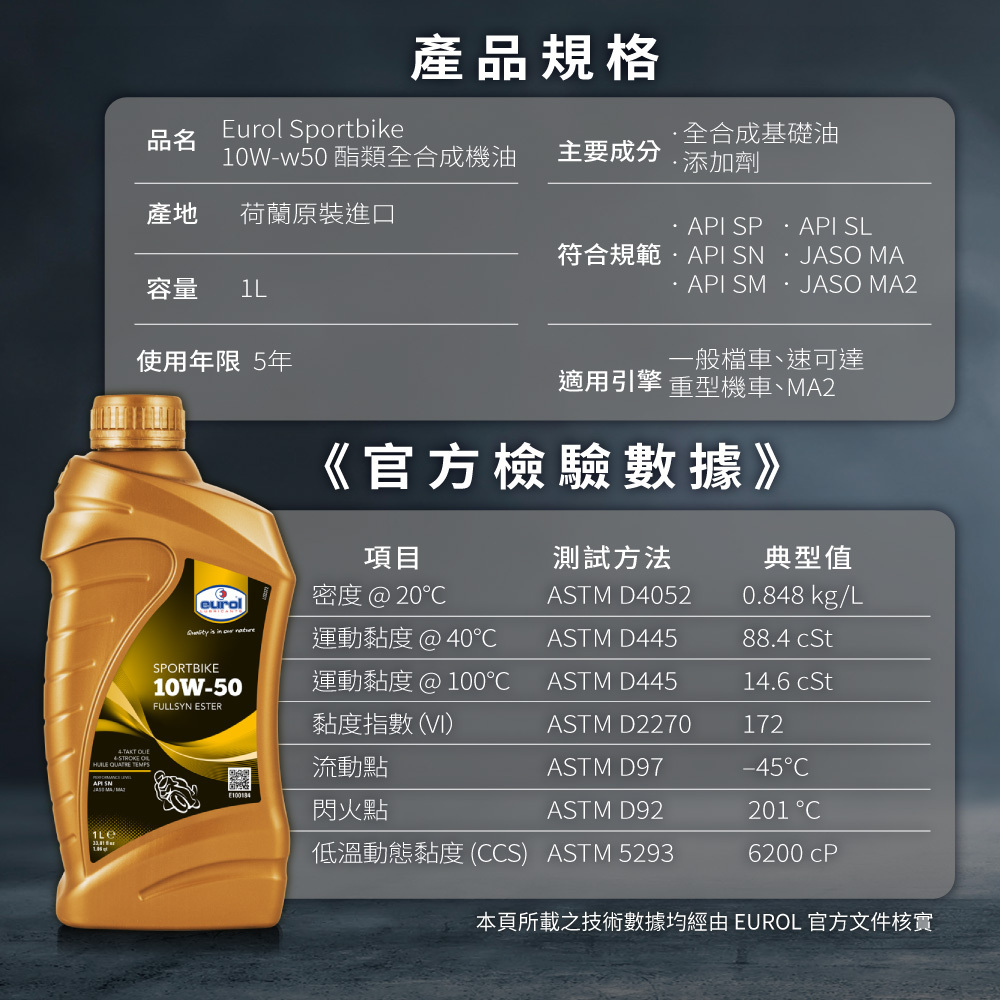 品名:Eurol Sportbike 10W-50 機車用酯類全合成機油